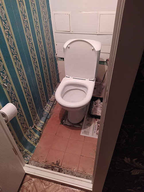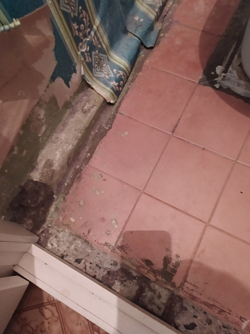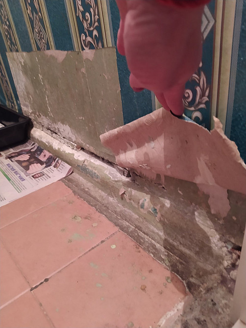 Нанесение декоративной штукатурки в санузле на 2 стены . Снятие цементного плинтуса и укладка плитки на пол . (заказ 84199)