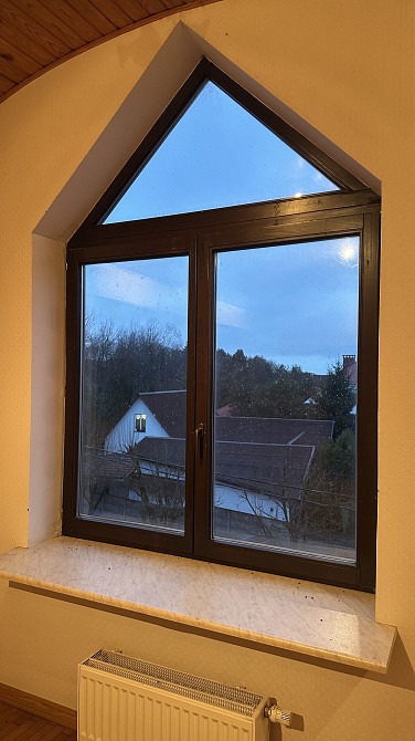 Необходимо демонтировать прямоугольную часть рамы, верхний треугольник оставить. Далее перевесить существующие створки на новую раму и установить окно. На новую раму створки уже примерялись и все монтажные отверстия насверлены. Примерный размер окна 1650х1570 мм. (заказ 82804)