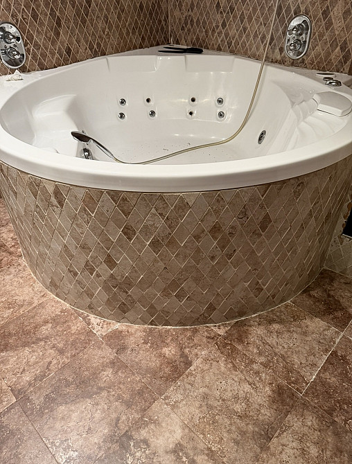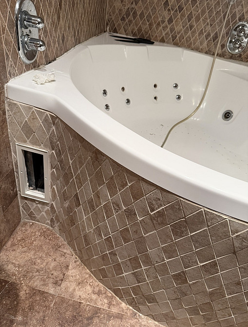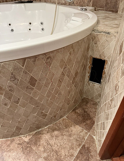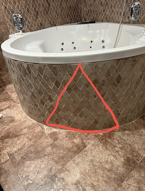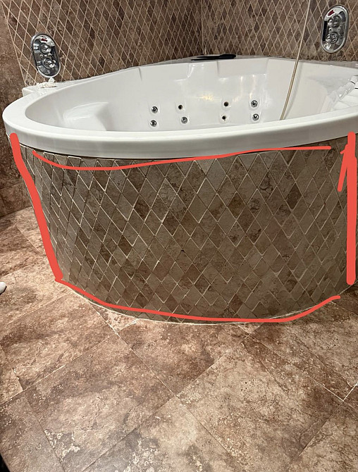 Вскрыть фронтальную часть экрана джакузи и сделать его съемным, границы выреза на фото. Экран по периметру на герметике, облицован мозаичной плиткой «ромбики» на криволинейной поверхности. (заказ 87270)