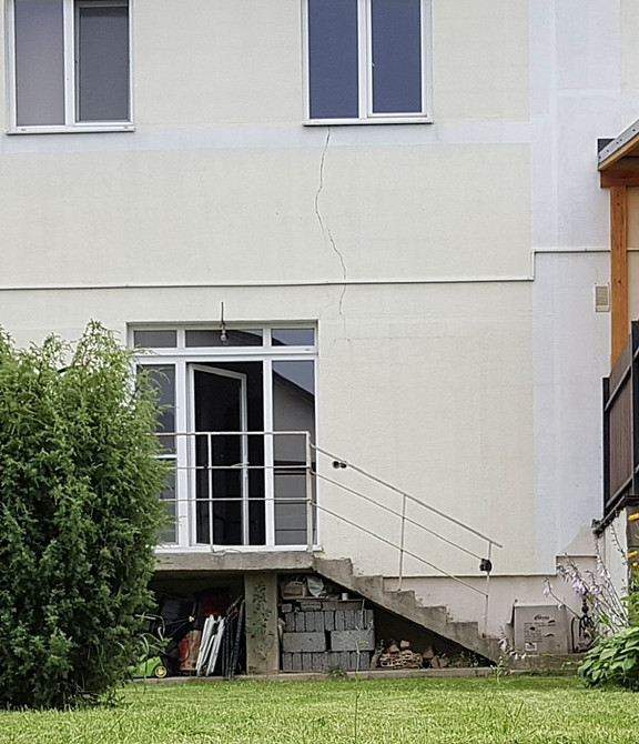 Фасад имеет большую трещину, которая начинается от крыши (уровень третьего этажа) и спускается вниз к первому этажу. Нужно заделать трещину и покрасить. На фотографии только часть трещины, которая уходит дальше вверх. (заказ 86635)
