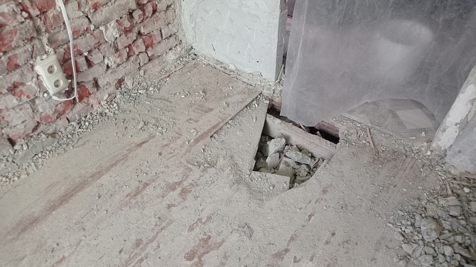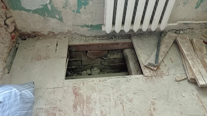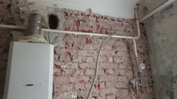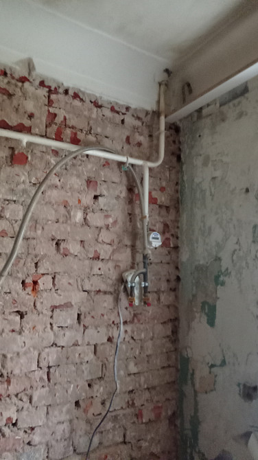 Выполнен неполный демонтаж штукатурки с кирпичных стен. Пол деревянный, требующий замены или капитального обновления. Должна быть переустановлена колонка газовая для обогрева воды, к которой подходит дымоход без смотрового окна, которое нужно установить (предварительно сняв колонку). Потолки с дранкой. Установить входную дверь (сдвижную). (заказ 83710)