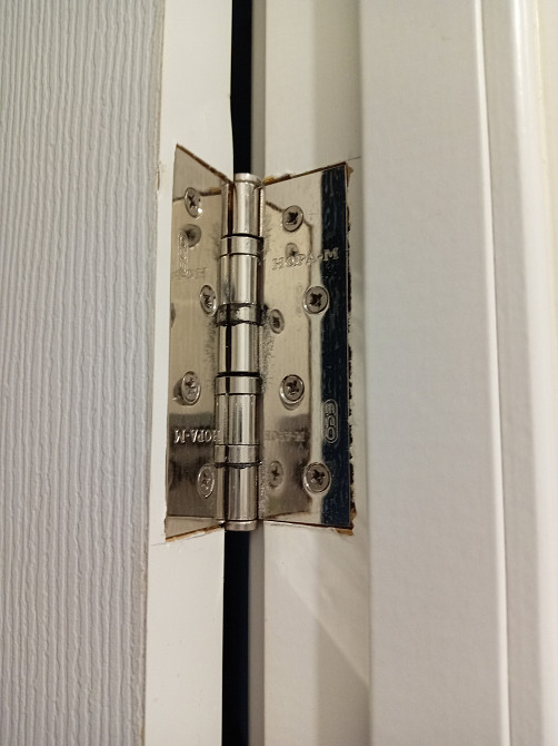 Провисла дверь в туалетной комнате. Переставить петли некуда, очень маленький зазор сверху. Дверь надо снять, подрезать, поставить обратно. (заказ 76623)