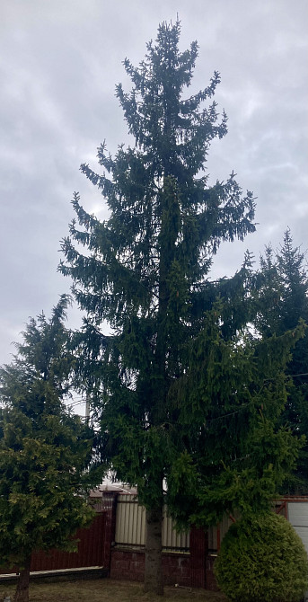 Спилить елку на моем участке в Ратомке, растет во дворе, повалить некуда, надо спиливать частями и бросать вниз на газон (заказ 72253)