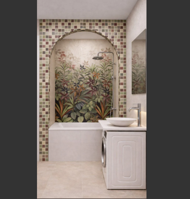 Нужно установить ванну и уложить плитку. Санузел - только пол около 1.5 метра. Ванна - 2 больших панно, стены, пол, арка мозаикой (смотрите рендер и раскладки). Интересует финальный расчёт и сроки. (заказ 87451)