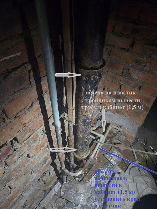 Офисное здание 7 этаж (9эт), нужно врезаться в существующий водопровод (полипропилен), вывести 1.5 м. трубы в кабинет, закрепить установить счетчик и кран. Заменить чугунную вставку канализационной трубы по стояку на пластик с ответвлением (тройник с ревизией) вывести трубу в кабинет 1.5м (заказ 84397)
