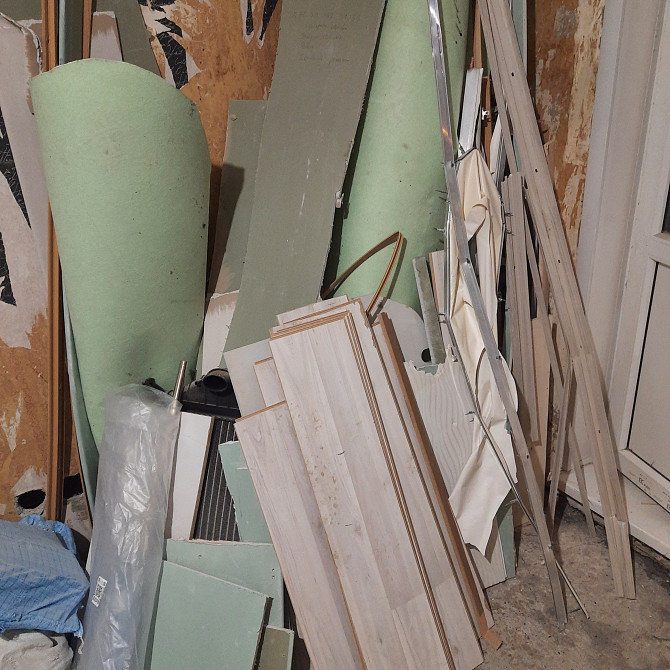 - негабаритный мусор (обрезки гипсокартона, направляющие подвесного потолка, пластиковый плинтус, несколько рулонов линолеума и прочее) - фото #5;