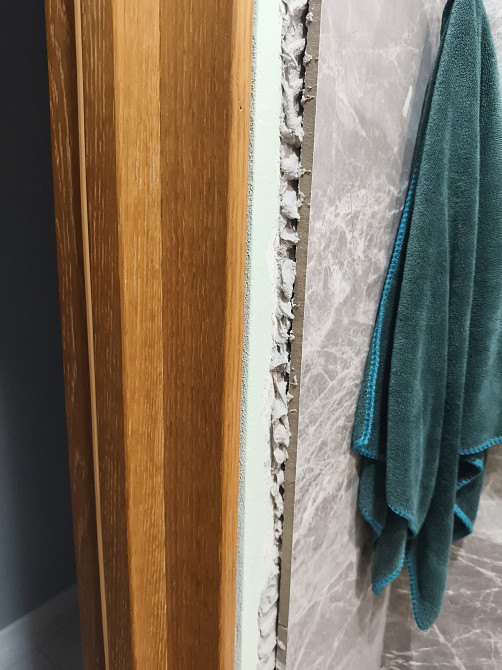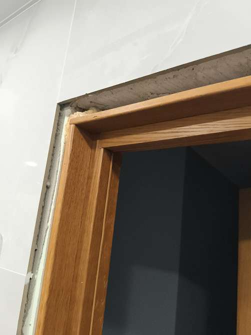 После укладки плитки в туалете и ванной наличник не прибивается, так как стена увеличилась на толщину плитки. Требуется заменить доборы на более широкие. Так же укрепить дверную коробку (. Шатается). (заказ 83876)